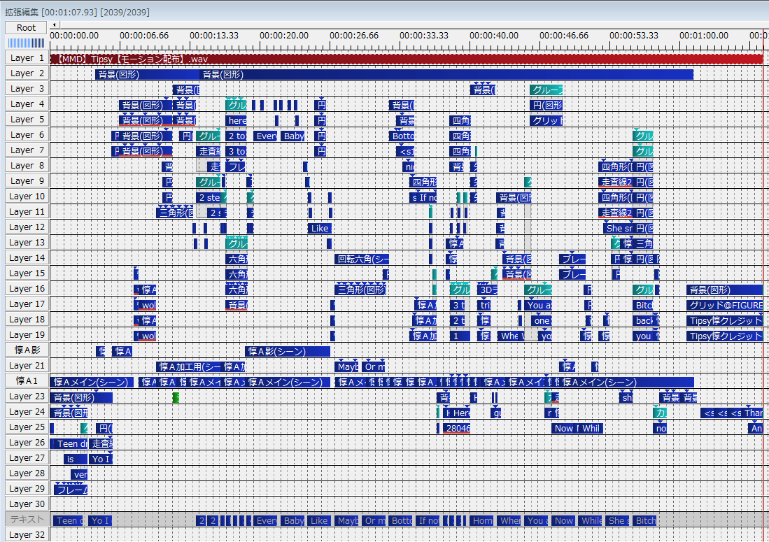 レイヤーの「テキスト」は仮置き。音に合わせて文字を出すために目安で置いています。
