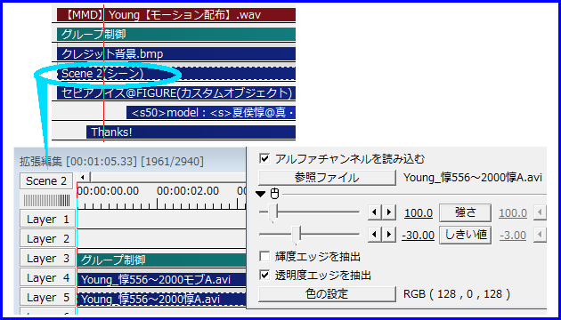 MMDからの出力は惇兄と影をキーイングエフェクトで出力した後、