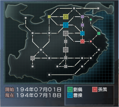 初期勢力図はこんな感じ。黄色は袁紹、紫は呂布です。他グレーは凡庸武将軍。